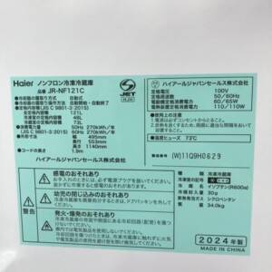 神奈川県横浜市神奈川区へ出張買取 Haier ノンフロン冷凍冷蔵庫 JR-NF121C 2024年製 使用感が少なく高評価で査定しました