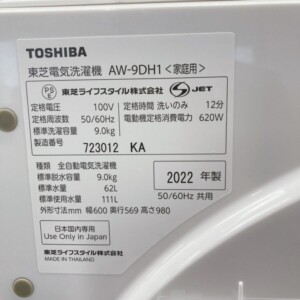 横浜市神奈川区でTOSHIBA 全自動洗濯機 AW-9DH1 2022年製を出張買取 使用感が少ないため相場を踏まえて査定しました