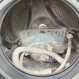 本体外観は目立つへこみや大きな傷は見られず、全体的にきれいな状態でした。ドア周辺や操作パネルにも使用に支障の出るダメージはなく、槽内はステンレス部分に使用に伴う軽微な水跡程度が確認できる状態です。付属品として給水ホース・排水ホース・取扱説明書類が揃っており、動作確認でも洗い・脱水・乾燥まで問題なく稼働することを確認しました。