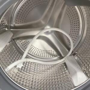 本体外観は目立つへこみや大きな傷は見られず、全体的にきれいな状態でした。操作パネルや前面ドア周辺にも使用による大きな劣化は確認されていません。槽内はステンレスドラムで、洗剤残りや強い汚れはなく、使用感は比較的軽微な印象です。給水ホースなどの付属品も揃っており、通電・洗い・脱水・乾燥まで一通りの動作確認を行った結果、問題なく稼働することを確認しました。