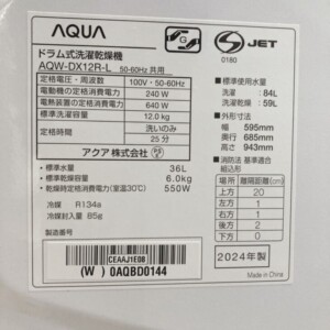 神奈川県川崎市川崎区へ出張買取 AQUA ドラム式洗濯乾燥機 AQW-DX12R-L 2024年製 使用感少なめのため適正価格で査定しました