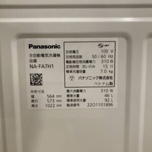 神奈川県川崎市多摩区へ出張買取 Panasonic 全自動電気洗濯機 NA-FA7H1 2022年製 使用感少なめのため適正価格で査定しました