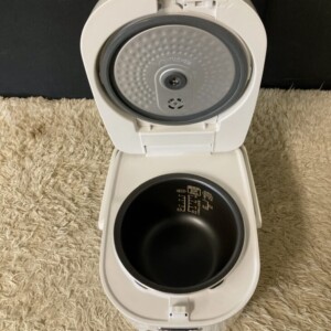本体外観は全体的に使用感はあるものの、目立つ傷や大きな汚れはなく比較的きれいな状態でした。操作パネルの文字かすれやボタン不良も見られず、日常使用に支障はありません。内釜についても、コーティングの剥がれや焦げ付きは確認されず、良好な状態を保っていました。通電確認のうえ、炊飯・保温機能ともに正常に動作することを確認しています。
