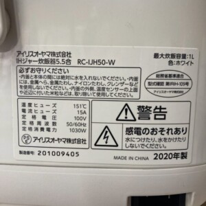 神奈川県茅ヶ崎市へ出張買取 アイリスオーヤマ IHジャー炊飯器 RC-IJH50-W 2020年製 使用感ありのため適正価格で査定しました