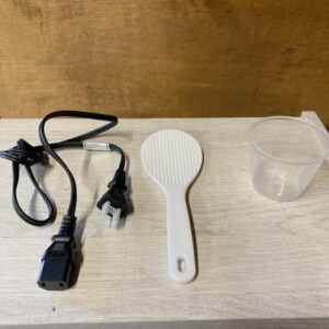 外装には日常使用に伴う細かな擦れや軽度の汚れが見受けられましたが、目立つ割れや大きなダメージはありませんでした。内釜はコーティングの剥がれはなく、炊飯目盛りもはっきり確認できる状態で、使用感はあるものの実用面での問題はありません。フタ裏やパッキン部分にも軽度の汚れは見られましたが、炊飯・保温・予約機能などの動作確認は良好でした。電源コード、計量カップ、しゃもじが付属している点も評価ポイントとなりました。