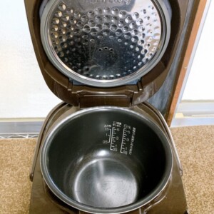 拝見した炊飯器は、外装に日常使用による細かな擦れや小傷が確認できました。内釜については全体的に使用感はあるものの、深い剥がれや大きな変形は見られない状態でした。内ぶたや蒸気口パーツも揃っており、炊飯・保温操作を含めた基本動作に問題はありませんでした。