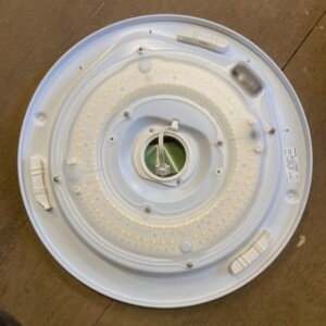ご依頼いただいたLEDシーリングライトは、カバー部分に軽度の汚れや細かな擦れが見受けられましたが、割れや変形はありませんでした。本体裏側や接続部にも目立つ破損はなく、通電確認および点灯確認も問題なく、通常使用に支障のない状態でした。内部LED基板にも焼損や発光ムラは確認されず、まだ十分使用可能なコンディションでした。リモコンは付属しておりませんでしたが、本体スイッチ操作での点灯確認ができたため再販可能と判断しました。
