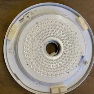 お預かりしたLED照明器具は、カバー全体に長年の使用に伴う使用感が見られる状態でしたが、黄ばみや強い汚れ、割れなどの大きなダメージは確認されませんでした。表面のくすみはあるものの、照明としての見た目を大きく損なうほどではなく、清掃により改善が見込める状態でした。付属のリモコンも揃っており、点灯・消灯、調光操作などの基本動作は問題なく確認できました。