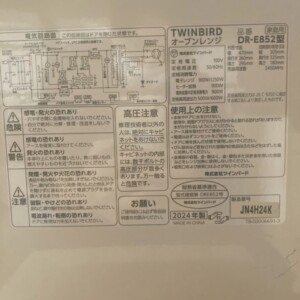 今回は東京都目黒区自由が丘にお住まいのお客様より、ツインバード オーブンレンジ DR-E852型(2024年製)を出張買取にてご依頼いただきました。