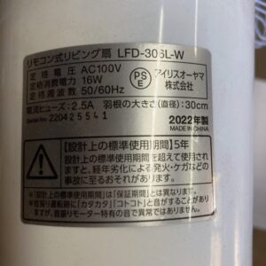 今回は東京都国分寺市にお住まいお客様より、アイリスオーヤマ リモコン式リビング扇 LFD-306L-W(2022年製)を出張買取にてご依頼いただきました。