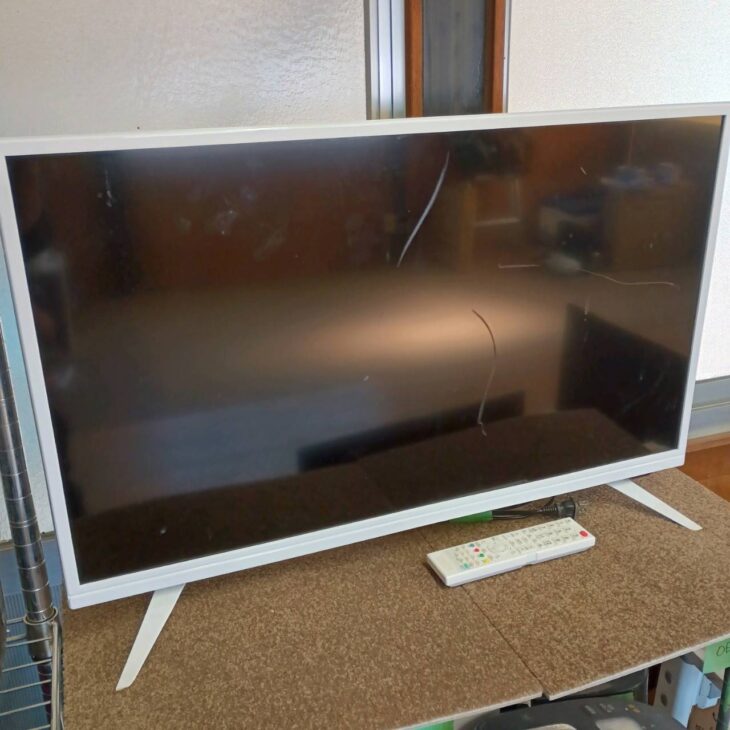 査定したテレビは通電・映像・音声ともに問題なく動作していました。液晶パネルには通常使用による軽微な擦れや拭き跡が見られましたが、視聴には支障のない状態でした。本体背面や脚部分にも使用に伴う小傷が確認されましたが、大きな破損や欠損はなく、中古品としては標準的なコンディションでした。リモコンと電源コードも付属しており、再販可能な状態と判断しています。