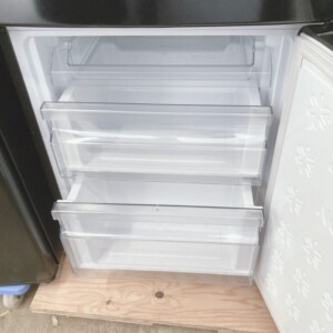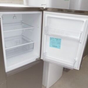 拝見したJR-NF148CKは、使用期間が比較的短く、庫内の棚やドアポケット、野菜ケースまで清潔感のある状態でした。外観には設置や使用に伴うごく軽度の擦れは見受けられましたが、目立つへこみや塗装剥がれはありません。冷蔵・冷凍ともに冷え具合は安定しており、異音もなく動作は良好です。庫内パーツも欠品がなく、実用面で評価できるポイントが揃っている印象でした。