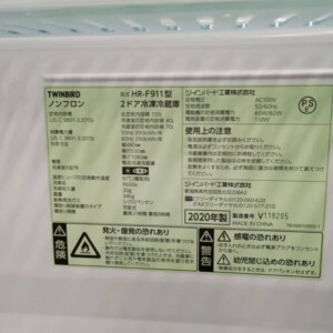 東京都狛江市でTWINBIRD ノンフロン冷凍冷蔵庫 HR-F911を出張買取 2020年製・使用感少なめの状態を踏まえて査定しました