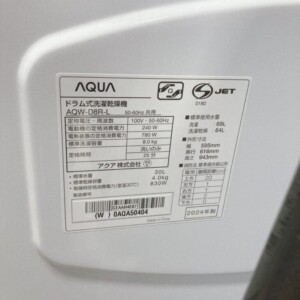 今回は東京都東大和市にお住まいの30代男性・会社員・単身世帯・賃貸(マンション)のお客様より、AQUA ドラム式洗濯乾燥機 AQW-D8R-L(2024年製)を出張買取にてご依頼いただきました。