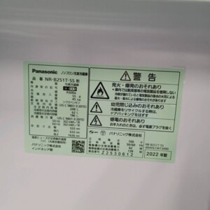 東京都小金井市にてPanasonic ノンフロン冷凍冷蔵庫 NR-B251T-SS 2022年製 状態良好のため適正価格で査定しました