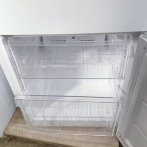拝見した冷凍冷蔵庫は外観に目立つ傷やへこみはなく、庫内も清潔に保たれている状態でした。棚やドアポケット、冷凍室ケースの欠品もなく、冷却動作も問題なく確認できました。全体的に使用感は少なめで、中古品としては扱いやすい印象です。