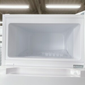 拝見した商品は全定格内容積87L(冷蔵室61L/冷凍室26L)のコンパクトタイプで、一人暮らし向けの2ドア冷蔵庫です。庫内には目立つ汚れやキズはなく、棚板やドアポケットの割れもありませんでした。冷凍室内もきれいな状態で、製氷皿も付属。外装にも大きなへこみや塗装剥がれは見受けられず、使用感の少ない美品コンディションでした。動作確認でも冷却機能に問題はありませんでした。