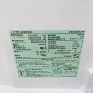 今回は葛飾区にお住まいの20代男性・会社員・単身世帯・賃貸(アパート)のお客様より、オーヤマ ノンフロン冷凍冷蔵庫 PRC-B092D-W(2024年製)を出張買取にてご依頼いただきました。