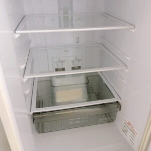 お品物は全定格内容積146L(冷蔵室100L/冷凍室46L)の2ドアタイプで、単身世帯向けのコンパクトモデルです。外観には大きなへこみや目立つ傷は見受けられず、全体的にきれいな状態でした。庫内のガラス棚も割れや欠けはなく、ドアポケットも透明感を保っています。冷凍室の引き出し内部も破損はなく、動作確認では冷却機能・温度調整ダイヤルともに正常に作動しました。2021年製という比較的新しい年式である点も査定の評価につながりました。