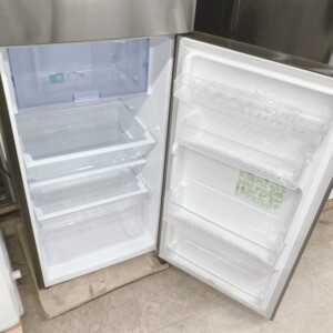 お引き取りしたSJ-D23D-Sは、定格内容積225Lの2ドアタイプで、一人暮らしや二人暮らしに人気のモデルです。外装のステンレス調パネルには目立つへこみや大きな傷は見受けられず、全体的にきれいな状態でした。庫内も棚板やドアポケットの割れはなく、透明ケースや製氷皿も揃っており清潔感のあるコンディションでした。動作確認では冷却機能も問題なく、冷蔵・冷凍ともにしっかりと冷えることを確認しております。