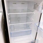 お引き取りした冷蔵庫は、正面側面の一部に小さな凹みが確認できましたが、塗装の大きな剥がれや深い傷はありませんでした。その他の外装部分は全体的にきれいな状態です。庫内は棚板・ドアポケットともに透明感があり、汚れや割れは見受けられません。冷凍室内も清潔で、製氷トレーや棚などの備品はすべて揃っている状態でした。動作確認でも冷却機能は正常で、使用感の少ない良好なコンディションです。