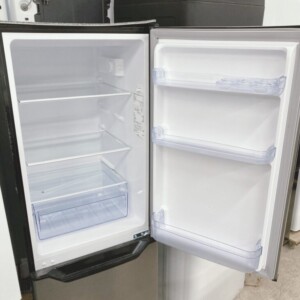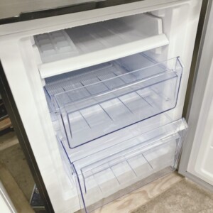 お引き取りした冷蔵庫は、外装に目立つへこみや大きな傷はなく、全体的にきれいで使用感の少ない状態でした。庫内の棚板やドアポケットも透明感があり、汚れやヒビは見受けられません。冷凍室内も清潔で霜の付着も少なく、引き出しの動きも良好です。製氷トレーや棚などの備品もすべて揃っている状態で、動作確認でも冷却機能は正常でした。2023年製と比較的新しいため、中古市場でも需要のあるモデルです。