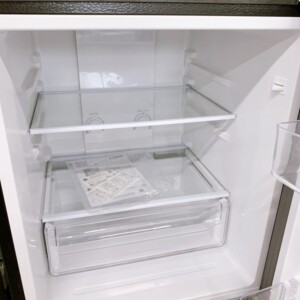 本製品は全定格内容積135L(冷蔵室85L/冷凍室50L)の2ドアタイプで、単身世帯に人気のサイズです。外観はダークシルバー調で大きなへこみはなく、側面にごく小さな擦れが見受けられる程度でした。庫内はガラス棚・野菜ケースともに破損なく揃っており、説明書も保管されていました。冷却動作も確認済みで、製氷トレーも付属。全体として使用感の少ないきれいな状態でした。