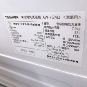 今回は港区麻布十番にお住まいの20代男性(会社員・単身・賃貸マンション)より、TOSHIBA 全自動電気洗濯機 AW-7GM2(2024年製)を出張買取にてご依頼いただきました。