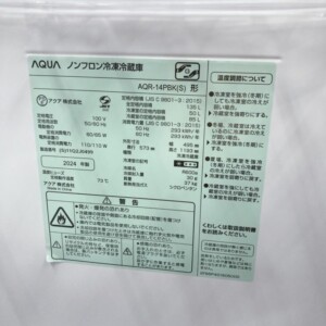 お預かりしたAQR-14PBK(S)は、外装に目立つへこみや大きな傷はなく、全体的に非常にきれいな状態でした。庫内の棚板やドアポケットも透明感があり、割れや欠けは見受けられません。冷蔵室・冷凍室ともに清潔感が保たれており、使用感はあるものの丁寧に使われていた印象です。動作確認でも冷却機能に問題はなく、正常に運転することを確認いたしました。