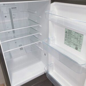 拝見したお品物は、全体的に外観に目立つへこみや大きな傷のないきれいな状態でした。扉前面にわずかな使用に伴う小傷は見受けられましたが、光の加減でわかる程度です。庫内も棚板・ドアポケットともに透明感が保たれており、割れやヒビはなく清潔感のあるコンディションでした。冷却動作も問題なく、冷蔵・冷凍ともにしっかりと温度が下がることを確認しております。