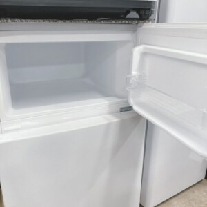 本製品は全定格内容積87L(冷蔵室61L/冷凍室26L)のコンパクトタイプで、一人暮らし用として流通量の多いモデルです。外観のホワイトパネルには使用に伴う細かな擦れが数か所見受けられましたが、目立つへこみや大きな割れはありませんでした。庫内はガラス棚・クリアケース・ドアポケットが揃っており、食品汚れやにおい残りも少なく比較的きれいな状態です。温度調整ダイヤルも正常に作動し、冷却動作も確認済みでした。