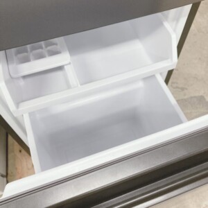 外観正面に使用による細かな擦れ跡がいくつか確認できましたが、目立つへこみや大きな塗装剥がれはありませんでした。庫内はガラス棚やドアポケット、冷凍室の製氷皿も揃っており、割れや欠損はなし。冷蔵・冷凍ともにしっかり冷却されることを確認しており、動作面に問題はありません。2023年製と年式も新しく、全体として再販に適した状態でした。