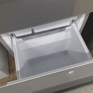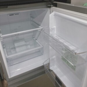 外観はシルバーカラーで、正面パネルに薄い擦れ跡が確認できましたが、目立つへこみや大きな傷はありませんでした。庫内はガラス棚やドアポケット、冷凍室の引き出しがすべて揃っており、割れやヒビも見受けられません。内部の汚れも少なく、冷蔵・冷凍ともに十分な冷却性能を確認できました。2022年製と比較的新しい年式であることも評価ポイントです。