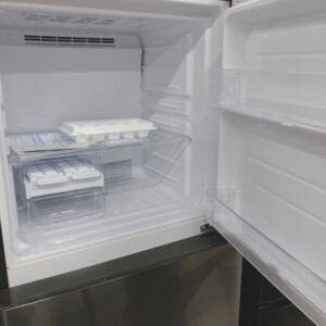 外観はステンレス調シルバーのため正面に細かな擦れや薄いキズが見受けられましたが、大きなへこみや目立つ打痕はありませんでした。使用期間が長いこともあり庫内に若干の使用感はあるものの、棚板やクリアケースの割れもなく、ドアポケットも破損はありません。冷却機能も確認し、冷蔵・冷凍ともに正常動作を確認済みです。製氷トレーや取扱説明書も付属しており、全体として再販可能な状態でした。