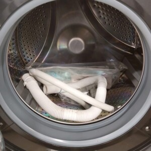 外観は目立つ傷や汚れがほとんど見られず、使用感の少ないきれいな状態でした。ドラム内部はステンレス槽の光沢が保たれており、カビや洗剤残りも少なく清潔感があります。排水ホース・給水ホース・取扱説明書などの付属品も揃っていました。動作確認では洗浄・脱水・乾燥機能すべて問題なく作動し、美品コンディションを維持していました。