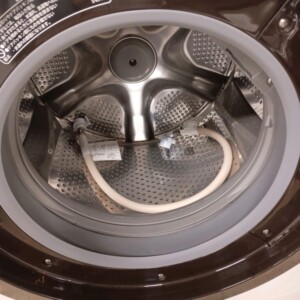 外観は大きな傷やへこみも見られず、全体的にきれいな状態でした。操作パネル周辺の使用感も少なく、ドア部分の透明カバーも良好なコンディションを保っています。内部ドラムはステンレス槽の光沢が残り、洗剤残りやカビの付着も見られず清潔な状態でした。給水ホースなど必要部品も揃っており、洗浄・脱水・乾燥機能すべて正常に作動しました。