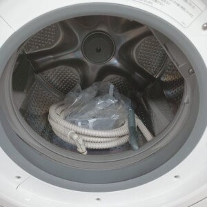 外観は目立つへこみや大きな傷はなく、全体的にきれいな状態でした。操作パネルの表示も正常で、各ボタンの反応も問題ありません。ドラム内部はステンレス槽にくすみはあるものの、サビや強い汚れの付着は見られませんでした。付属の給排水ホースも揃っており、通電後の動作確認では洗い・すすぎ・脱水・乾燥まで一連の動作に異常はありません。2022年製で比較的新しく、BIG DRUMシリーズの大容量モデルという点も評価対象となりました。