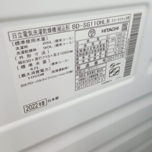 今回は東京都千代田区丸の内にお住まいの30代女性・会社員・単身・賃貸(マンション)のお客様より、HITACHI 日立 ドラム式電気洗濯乾燥機 BD-SG110HL(2022年製・洗濯11.0kg/乾燥6.0kg)を出張買取にてご依頼いただきました。