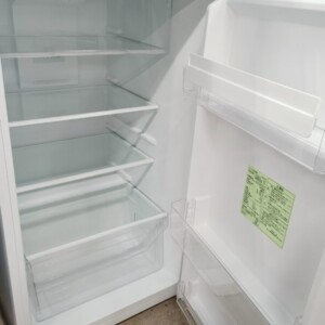 拝見した冷蔵庫は外観に目立つ傷やへこみが見られず、全体的に清潔感のある状態でした。庫内のガラス棚やドアポケット、野菜ケースも透明感が保たれており、使用に伴う汚れの蓄積は少なめです。冷却機能も正常に作動しており、冷蔵・冷凍ともに安定した温度保持が確認できました。製氷トレーも付属しており、日常使用に支障のない良好なコンディションでした。