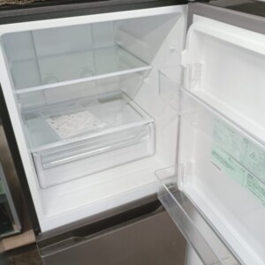 拝見した冷蔵庫は外観に目立つ傷やへこみが見られず、全体的に非常にきれいな状態でした。庫内のガラス棚やドアポケットは透明感が保たれ、汚れやにおいの付着もほとんどありません。野菜ケースや冷凍室トレーも揃っており、動作確認でも冷却性能に問題は見られませんでした。付属の取扱説明書も保管されており、使用期間の短さがうかがえるコンディションでした。
