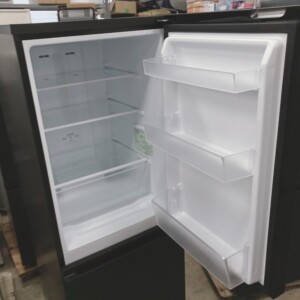 お品物は容量180L(冷蔵室120L/冷凍室60L)の2ドアタイプで、カラーは落ち着いたブラック。外観には目立つ傷やへこみはなく、庫内も棚板・ドアポケットともにきれいな状態でした。冷却動作も問題なく、異音や冷えムラも確認されませんでした。使用期間が短かったこともあり、全体的に清潔感のあるコンディションでした。