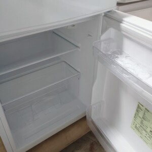 本製品は容量85Lのコンパクト2ドアタイプで、一人暮らしやセカンド冷蔵庫として需要の高いモデルです。外観には目立つ傷やへこみは見られず、使用に伴う軽微な擦れ程度で全体的にきれいな状態でした。冷凍室には製氷トレーが付属し、冷蔵室の棚やドアポケットも透明感が保たれており、庫内は清潔感のある状態です。動作確認では冷却機能に問題はなく、庫内灯も正常に点灯しました。