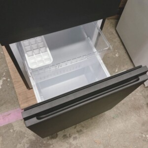 本製品はコンパクトながら使い勝手に優れた2ドアタイプの冷凍冷蔵庫です。外観はマットブラックの落ち着いたデザインで、目立つ傷やへこみは見受けられず良好な状態でした。庫内は棚板やドアポケットに透明感があり、食品臭や変色もなく清潔な印象です。冷凍室の引き出しや製氷トレーも揃っており、動作確認において冷却性能も問題ありませんでした。使用期間が短く、全体的にきれいな状態が保たれている点が評価ポイントとなりました。