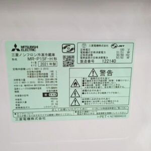 今回は台東区にお住まいの30代男性・会社員(単身世帯/賃貸マンション)より、三菱電機 ノンフロン冷凍冷蔵庫 MR-P15F-H(2021年製)の出張買取をご依頼いただきました。コンパクトながら使い勝手の良い容量で、一人暮らし世帯を中心に需要の高いモデルです。