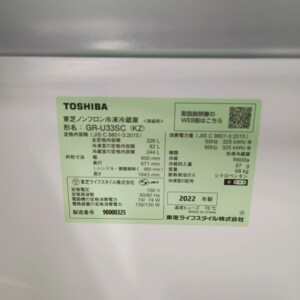 今回は八王子市にお住まいの40代男性・会社員・親子世帯・持ち家(一戸建て)のお客様より、TOSHIBA ノンフロン冷凍冷蔵庫 GR-U33SC(2022年製)を出張買取にてご依頼いただきました。