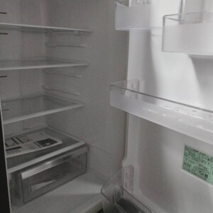 お引き取りした冷蔵庫は、外装に目立つ凹みや深い傷は見られず、光沢面に軽微な使用擦れがある程度で全体的に良好な状態でした。庫内は棚板やドアポケットの透明感が保たれており、食品臭の付着もなく清潔な状態です。野菜室ケースの割れや欠けもなく、冷却動作・庫内灯ともに正常でした。2022年製と比較的新しく、丁寧に使用されていたことがうかがえるコンディションでした。