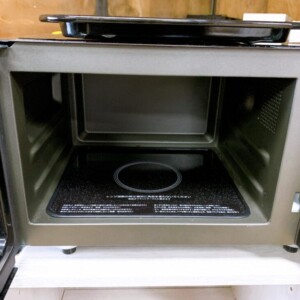 本体外装には通常使用に伴う細かな擦れが見受けられるものの、大きなへこみや割れはありません。庫内はフラットタイプで焦げ付きや油汚れが少なく、内部の状態は良好です。付属の角皿も揃っており、レンジ・グリル・オーブン機能すべて正常に動作することを確認しました。全体的に見て丁寧に使用されていたことが分かるコンディションでした。