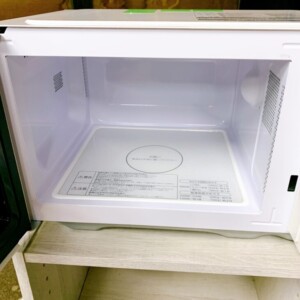 外観は目立つ傷や変色がなく、ドアや操作パネル周辺もきれいな状態でした。庫内はフラットタイプで、食品の飛び散りや焦げ付きはほとんど見られず清潔感があります。底面プレートの擦れも少なく、加熱動作や出力切替、タイマー操作も問題ありませんでした。使用頻度が少なかったことがうかがえる良好なコンディションで、再販前のクリーニング負担も軽微な状態でした。