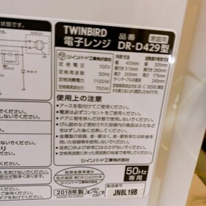 今回は武蔵村山市にお住まいの50代女性・主婦(親子世帯/持ち家一戸建て)のお客様より、ツインバード 電子レンジ DR-D429(2018年製)を出張買取にてご依頼いただきました。