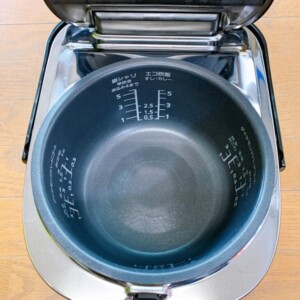 お引き取りしたIHジャー炊飯器は、外装に通常使用による軽微な擦れが見られるものの、目立つ破損や大きな傷はなく全体的にきれいな状態でした。内釜のフッ素加工も良好で、剥がれや深い傷は見られません。操作パネル表示は鮮明で、炊飯・保温機能ともに正常動作を確認しました。蒸気口周辺にも焦げ付きや過度な汚れはなく、日常的に丁寧に使用されていた様子がうかがえます。